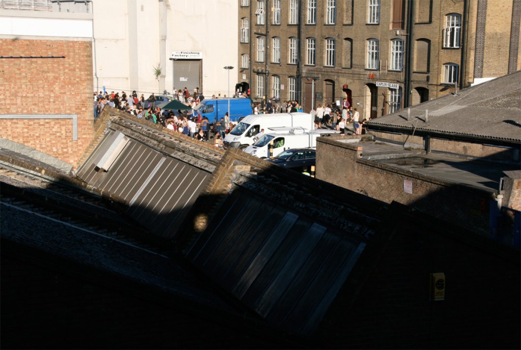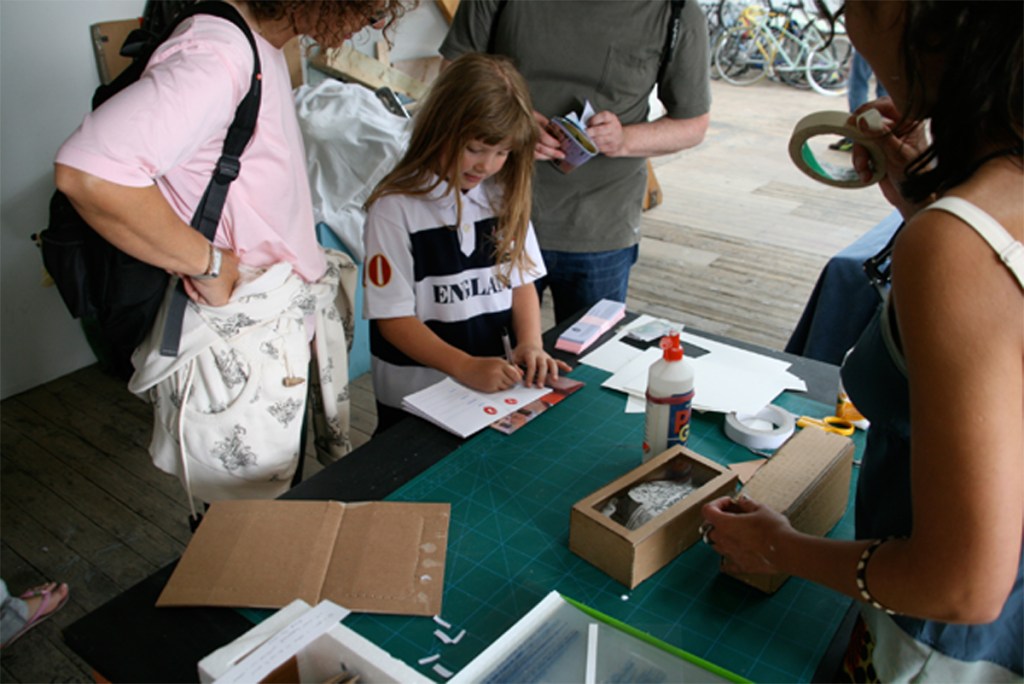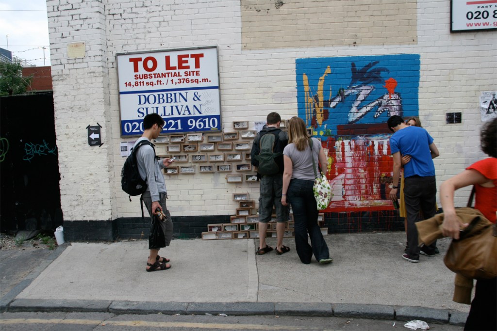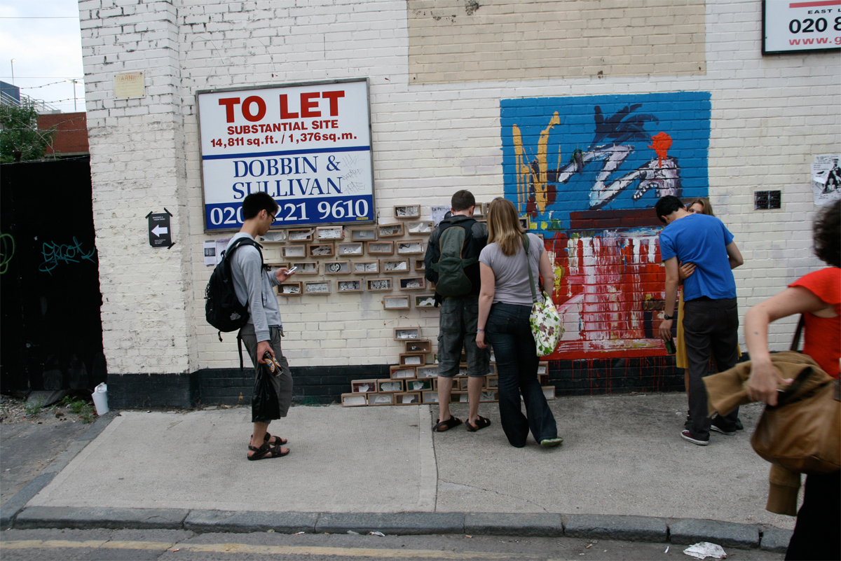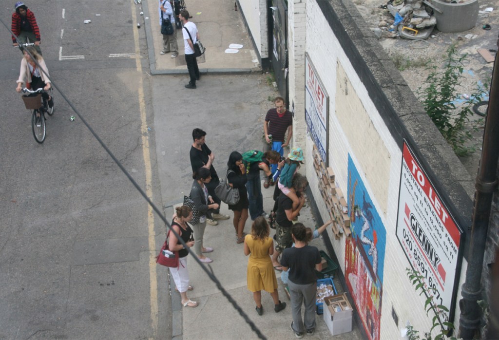 During the Hackney Wicked Festival in August 2010 [population flow] took the shape of a cardboard brick news wall where each brick contained a chapter of the news collection. Inside each brick were cut outs of scenarios of how people have access to news and how that varies from an individualistic experience to a mass absorption event.