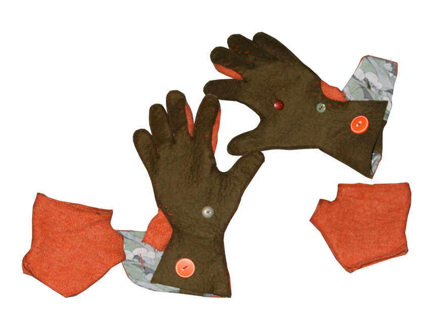 Gloves made with felt and re-used fabrics. Can be over-layered with mittens depending on how cold it is.