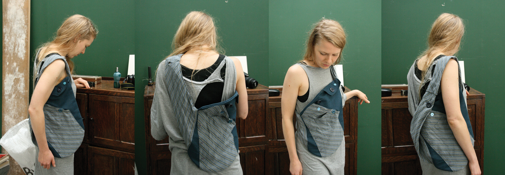 Hand bag and cycling bag made with re-used clothes. Adjustable to fit different occasions.