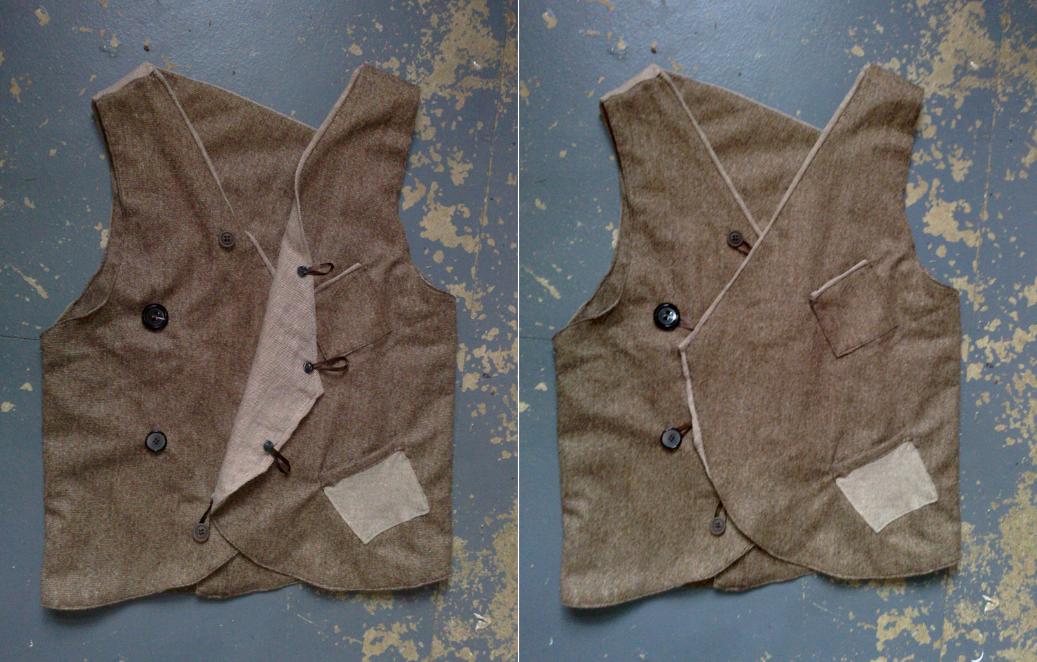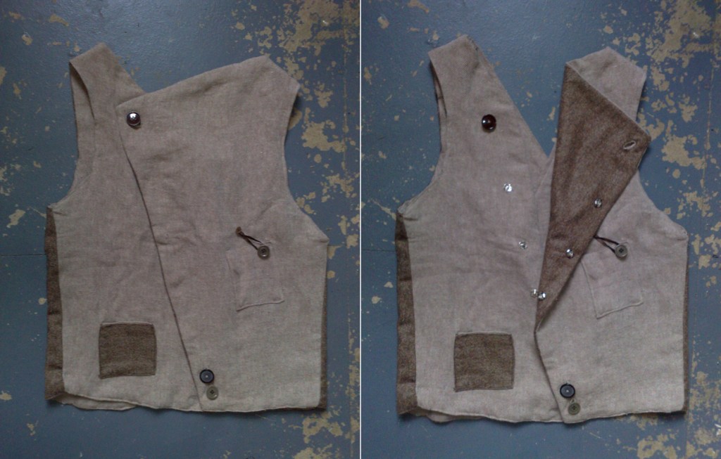 Waistcoat that can be used from both sides. Back and front are interchangeable depending on what one wears underneath.